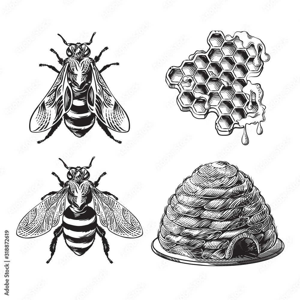 Set Of Bee Wasp Honeycombs And Hive Vintage Monochrome Drawing Engraving Graphic Apiary Hand Drawn Collection Of Insects Design Element Retro Styled Tattoo Black And White Vector Illustration Stock Vector Adobe